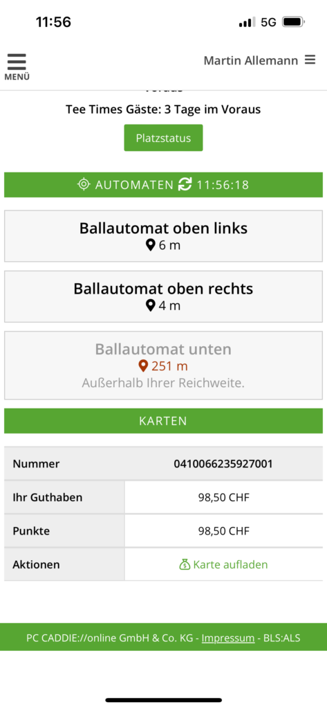 In der PC-Caddie App im Menu die Funktion «Ballautomaten» aufrufen. Wenn Sie nahe bei den Ballautomaten stehen, können so Bälle bezogen werden. Mit «Karte aufladen» kann das Guthaben auf der Ballkarte geladen werden, Bezahlung mit Kreditkarte oder Paypal.