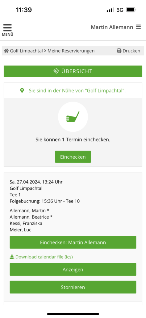 Wenn Sie vor der Runde nahe am Golfplatz sind (z.B. auf dem Parkplatz) können sie direkt vom Smartphone aus mit einem Click für die Runde einchecken. Dazu in der PC-Caddie App unter «Meine Reservierungen» die Funktion Check-In aufrufen.